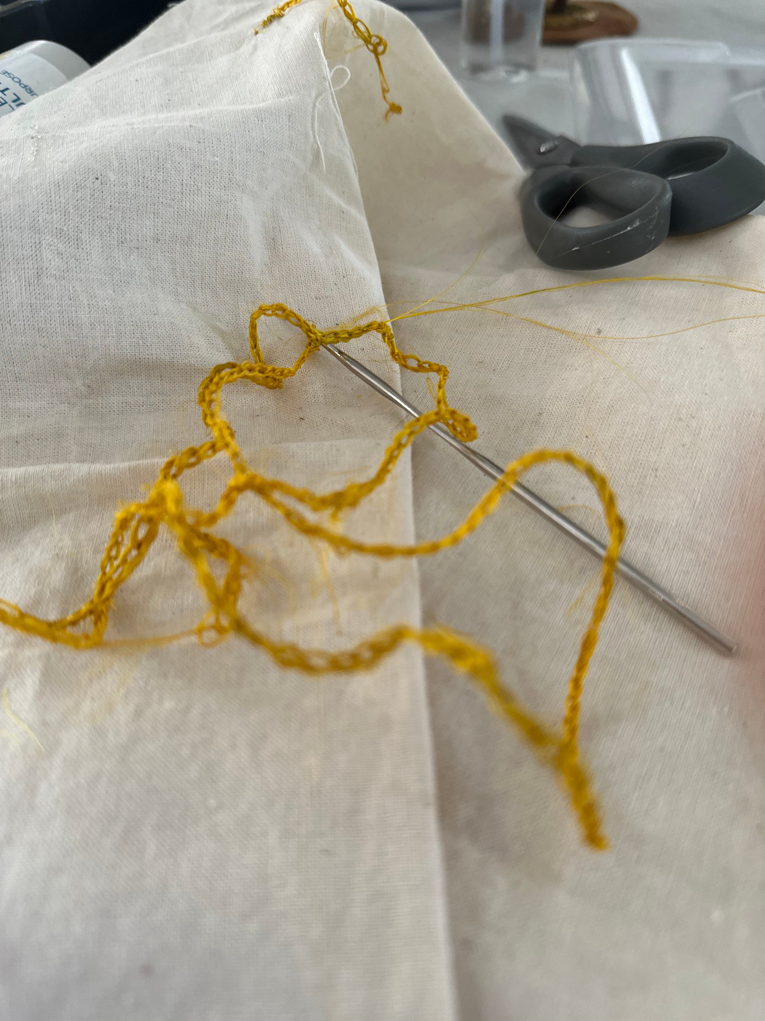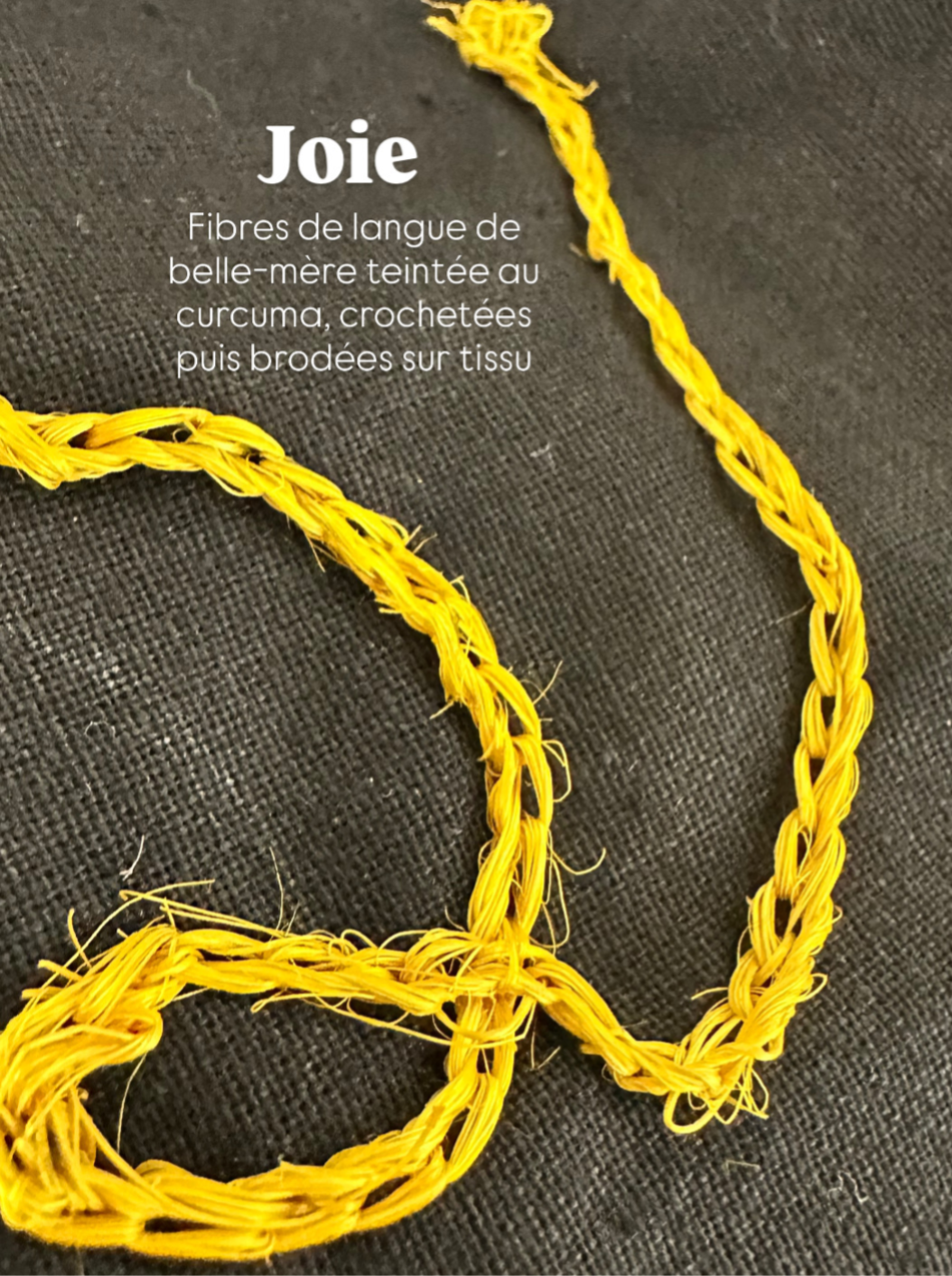 Ci-dessus : Travaux expérimentaux avec des fibres de sansevière teintes au curcuma, crochetées puis brodées, broderies avec fibres d'atoumo.